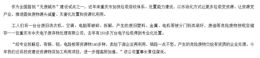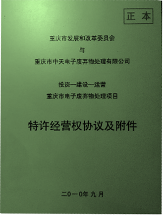 從2010年開始,公司就是重慶市政府公開招投標(biāo)確定的重慶市電子廢棄物處理特許經(jīng)營權(quán)企業(yè),在重慶市“一小時經(jīng)濟(jì)圈”范圍內(nèi)23個區(qū)縣,開展電子廢棄物綜合回收機(jī)處理處置業(yè)務(wù)。